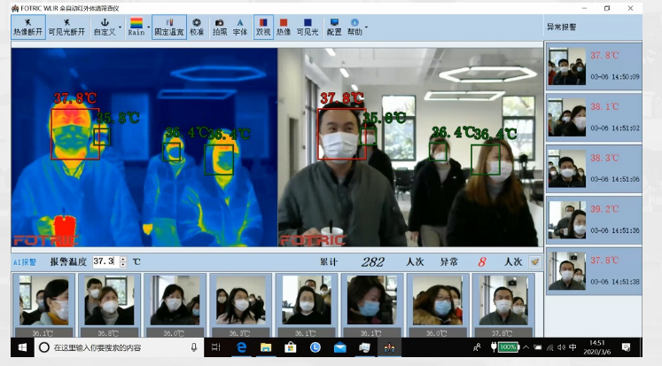 Fotric 692Pro全自動紅外體溫篩查儀標配WLIR體溫篩查專用軟件,WLIR內置人數(shù)統(tǒng)計和預覽功能,自動統(tǒng)計已篩查人員數(shù)量和篩查過程中報警的疑似發(fā)燒人員數(shù)量,實現(xiàn)疫情防控數(shù)據化。