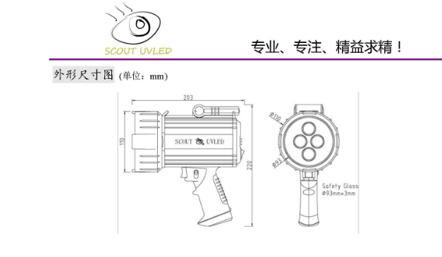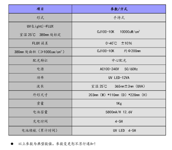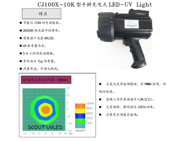 CJ100-10K型 手持式黑光燈,通用設(shè)計(jì),僅1000g。性能非常強(qiáng)悍!高達(dá)10000uw/cm²的中心輻照度。365nm波長(zhǎng)非常純正。溫升≯8℃。有白光照明功能。適合行業(yè):NDT探傷、脫脂檢測(cè)、醫(yī)藥原材料