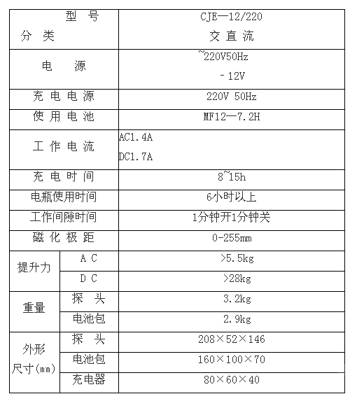 CJE系列微型磁軛探傷儀有交流、直流、交直流兩用磁粉探傷儀,直流供電電源為可充電池,適用于野外無電源現(xiàn)場操作以及高壓不能進入的容器、橋梁、管道等現(xiàn)場操作,一次充電連續(xù)工作時間可達6小時以上。交流供電電源采用~220V電源直接輸入,無需其他儀器配套,操作方便、簡單、重量輕、便于攜帶,因而該儀器得到廣泛使用。