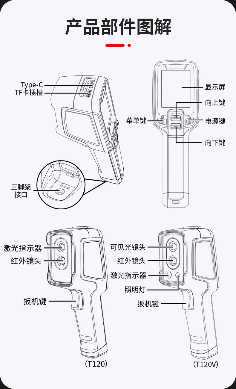 詳細參數(shù)產品型號 T120 T120V 紅外圖像與光學 探測器類型 120×90@17μm,VOx 工作波段 7.5~14μm 幀頻 25Hz/9Hz 熱靈敏度/NETD 60mk 焦距 2.28mm/F1.13 視場角 50°×38° 空間分辨率 7.6mrad 距離系數(shù)比 130:1 調焦方式 免調焦 可見光 可見光類型 / 320×240, 免調焦 照明燈 / 有 圖像顯示 顯示器類型 2.4英寸 IPS技術TFT顯示屏 分辨率 320×240 圖像模式 紅外圖像 紅外圖像,可見光圖像,畫中畫 調色板 6條( 白熱、鐵紅、熱鐵、北極、彩虹1、彩虹2) 測溫 測溫范圍 -20°C-150°C, 100°C-400°C(自動切檔) 測溫精度 ±2°C或±2%取大值 測溫點 中心點 測溫區(qū)域 3個(*高溫、*低溫跟蹤) 自動高/低溫跟蹤 有 報警 全屏*高溫/低溫報警 圖片存儲 存儲介質 TF卡(標配16G,*大支持32G) 圖片格式 帶溫度數(shù)據(jù)的jpg格式(120*90) 單獨保存可見光圖片 / 有,存儲圖片分辨率為320*240 通信方式 USB TYPE-C、TF卡槽 Wi-Fi / 有,可連接移動終端進行數(shù)據(jù)傳輸 激光 有 三腳架接口 有 移動終端APP / 有 PC紅外分析軟件 有 電源系統(tǒng) 電池類型 可充電鋰離子電池 電池工作時間 >8小時 >5小時 充電時間 直充,≤2.5小時 環(huán)境參數(shù) 工作溫度 -10°C~50°C 存儲溫度 -40°C~70°C 封裝 IP54,抗2m跌落 認證 CE/ROHS/FCC 重量 約350g 尺寸 194mm×61.5mm×76mm 標配件 充電頭+適配器、TYPE-C數(shù)據(jù)線、腕帶、快速操作指南、資料下載卡、16G TF卡