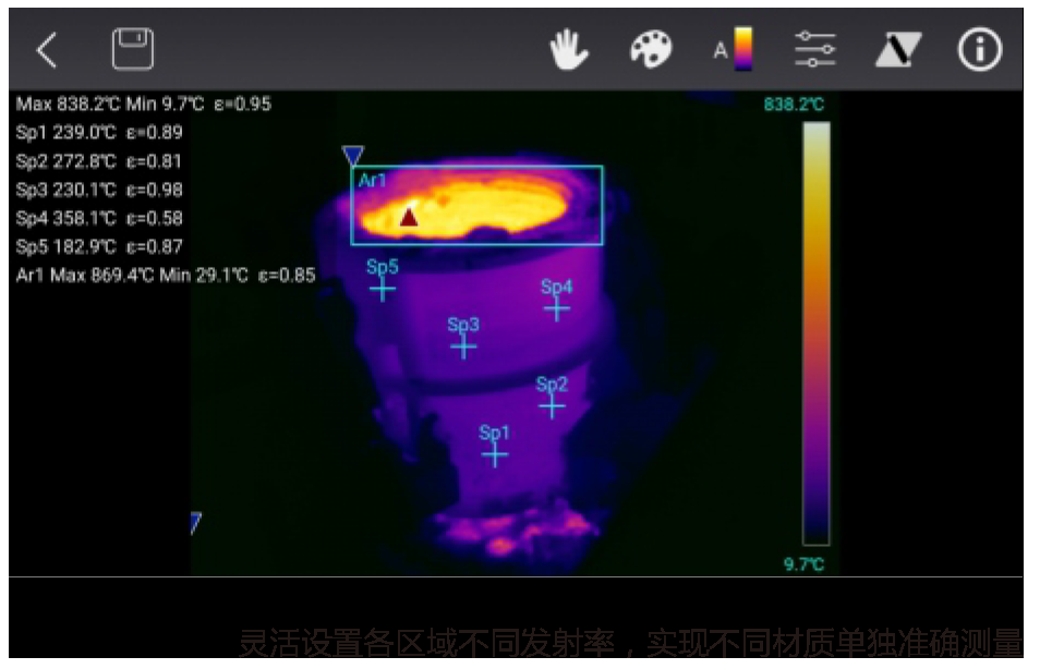 卓越的現(xiàn)場分析功能,低溫自動捕捉,12點12區(qū)3線自定義測溫;靈活分區(qū)域發(fā)射率設(shè)置,測溫參數(shù)修正。 全輻射熱像