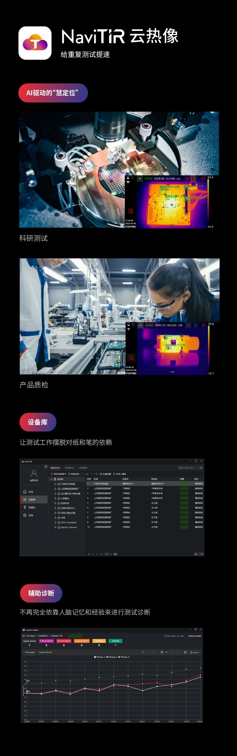云熱像根據(jù)產(chǎn)品信息建立預(yù)設(shè)了識(shí)別和診斷模型的設(shè)備庫,質(zhì)檢時(shí)云熱像的TurboFocus智能對(duì)焦系統(tǒng)自動(dòng)調(diào)用設(shè)備庫的識(shí)別和診斷模型,自動(dòng)識(shí)別被測(cè)產(chǎn)品的不同測(cè)點(diǎn)并匹配與之對(duì)應(yīng)的測(cè)量工具和診斷規(guī)則,快速判斷產(chǎn)品是否合格。