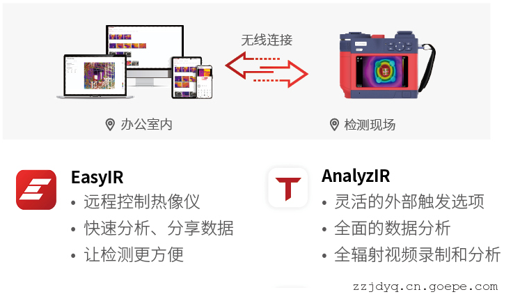 熱像儀與PC軟件連接,實(shí)時(shí)顯示、傳輸、錄制、分析全輻射熱像視頻流。