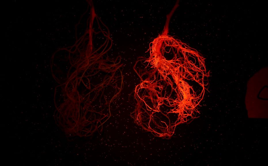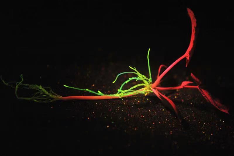 上圖為用LUYOR-3145RG照射大豆根系中的gfp熒光蛋白的表達(dá)。