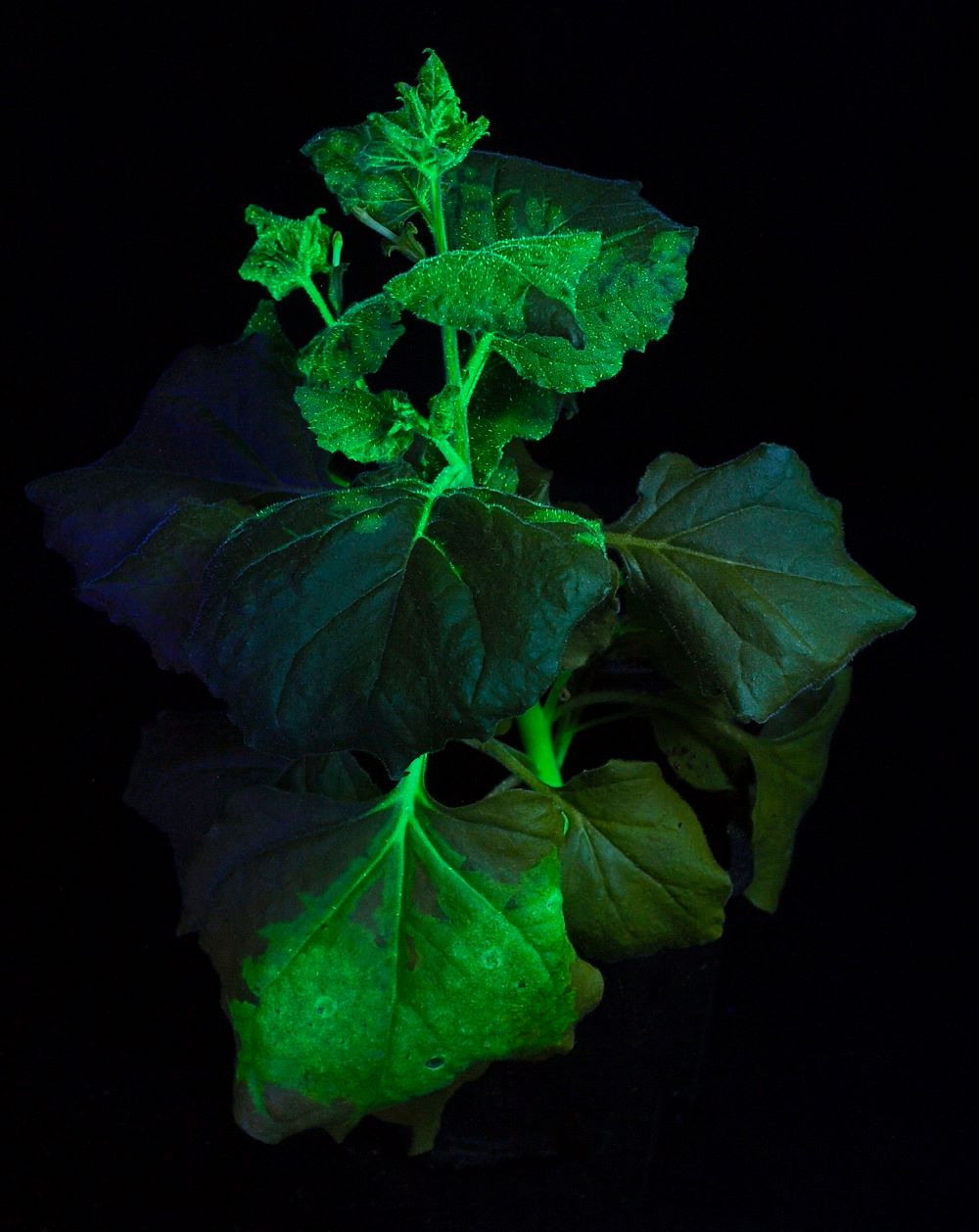 上圖為L(zhǎng)UYOR-3415RG照射煙草葉片中的GFP瞬時(shí)表達(dá)。