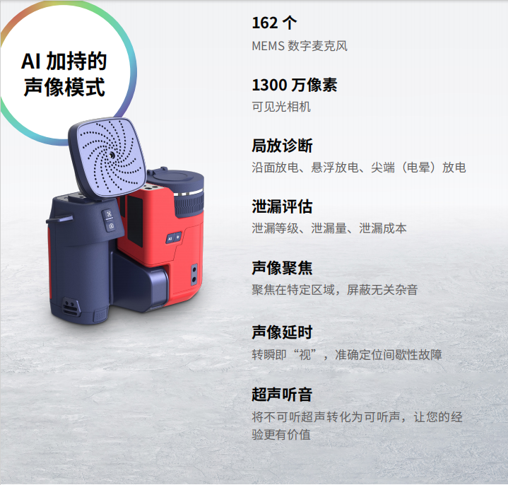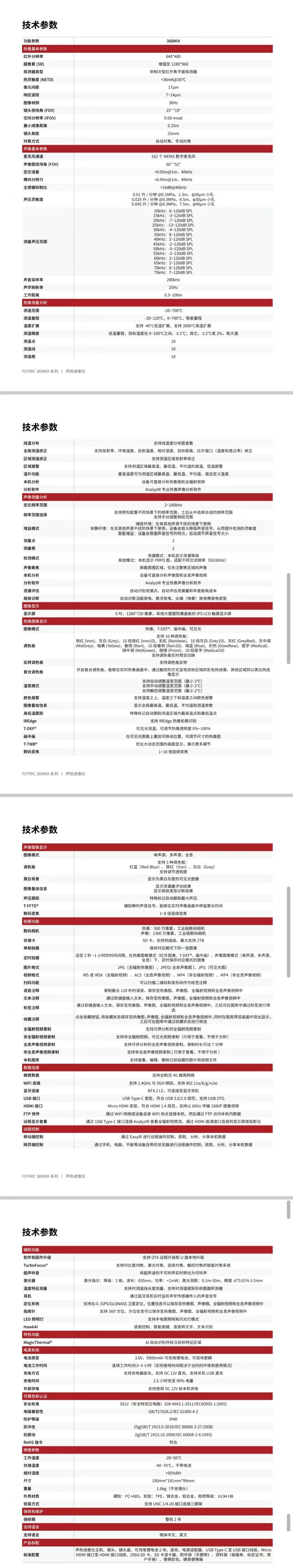 詳細信息| 詢價留言品牌:飛礎(chǔ)科 型號:368MIX 類型:便攜式 測量范圍:-20-700°可擴展2000° 測量精度:±1° 分辨率:640X480 尺寸:190x181x99 mm 重量:1.6 kg 分辨率:640X480 什么是“聲熱成像儀”熱像和聲像的二合一產(chǎn)品。它同時具備熱像儀和聲像儀的能力,可以輕松做到精準(zhǔn)測溫、高清成像,又能快速準(zhǔn)確地完成泄漏評估和局放診斷.當(dāng)您遇到以下場景時,您需要用到聲熱成像儀的熱像模式:電氣設(shè)備、傳動裝置、高溫容器、保溫設(shè)備等有潛在熱失效隱患的設(shè)備。640*480 像素探測器IREdge 圖像細節(jié)增強既有清晰的熱梯度方便分析,又有被測物的細 節(jié)方便查看。