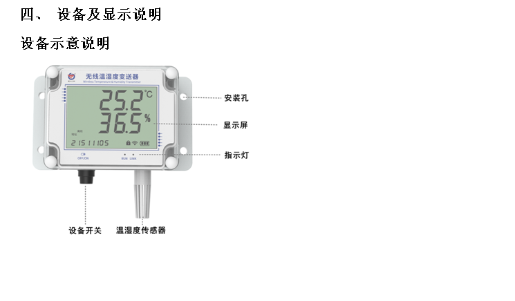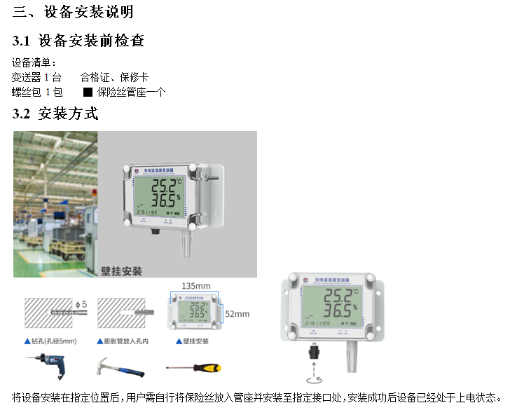 1.3主要技術(shù)指標(biāo)供電 鋰電池供電 準(zhǔn)精度 濕度 ±3%RH(60%RH,25℃) 溫度 ±0.5℃(25℃) 電路工作溫濕度 -40℃~+60℃,0%RH~95%RH(非結(jié)露) 探頭工作溫度 -40℃~+120℃ 默認(rèn):-40℃~+80℃ 探頭工作濕度 0%RH-100%RH 長(zhǎng)期穩(wěn)定性 濕度 ≤1%RH/y 溫度 ≤0.1℃/y 輸出信號(hào) NB-IoT 安裝方式 壁掛式 使用時(shí)長(zhǎng) 6年以上 上傳數(shù)據(jù)間隔 60min(默認(rèn)) 天線 內(nèi)置 -
